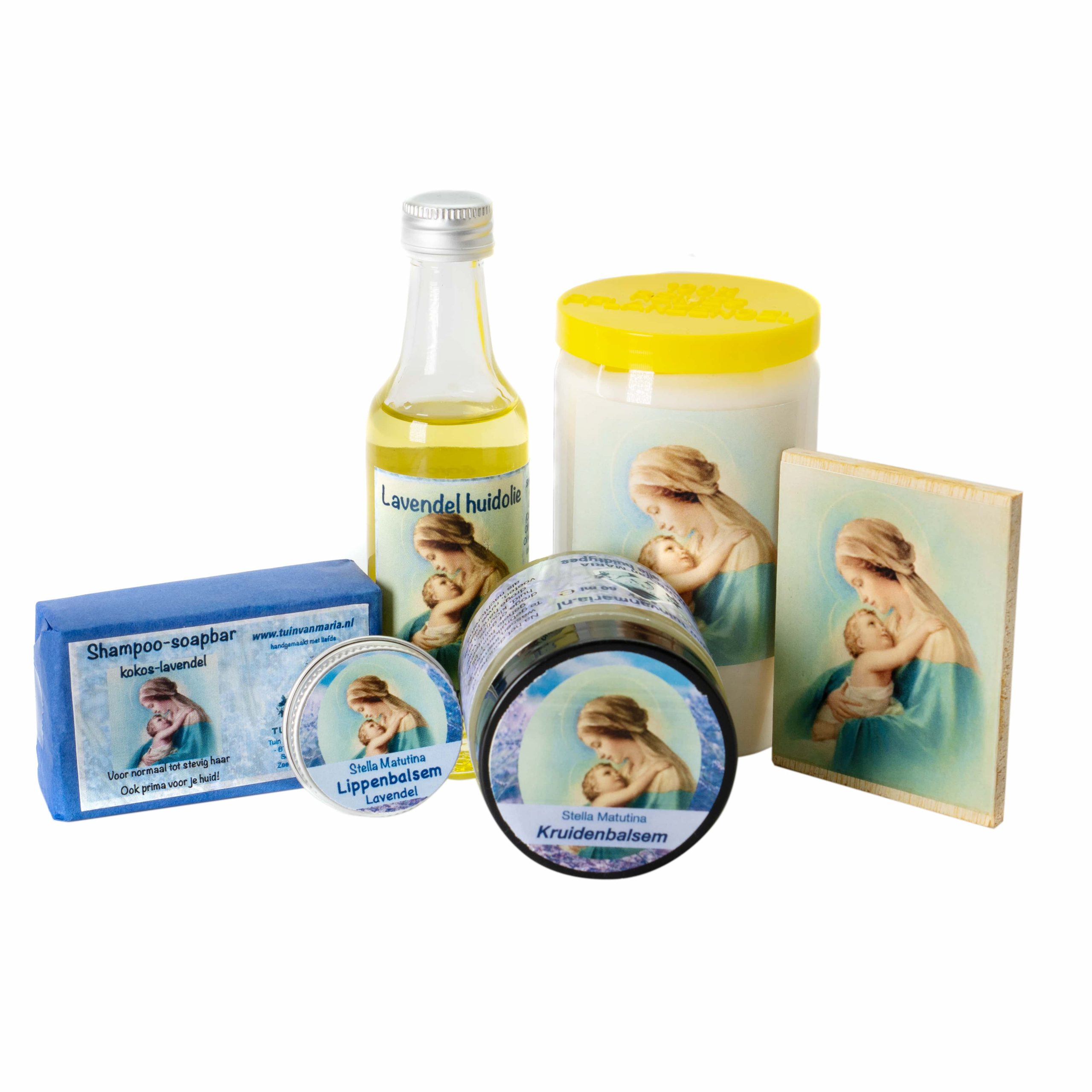 Dit is bijvoorbeeld ook een leuk Kerstgeschenk, of verrassings-kado. Kijk bij de variaties en je ziet en leest precies wat erin zit! Inhoud: Stella Matutina kruidenzalf: blikje; Stella Matutina Lippenbalsem; maria 3-dagenbrander; maria icooontje (diverse afbeeldingen) Zeepje: Lavendelzeepje met essentiële lavendelolie of Shampoobar (40-65 gr); Lavendelolie voor de huid: 30 ml